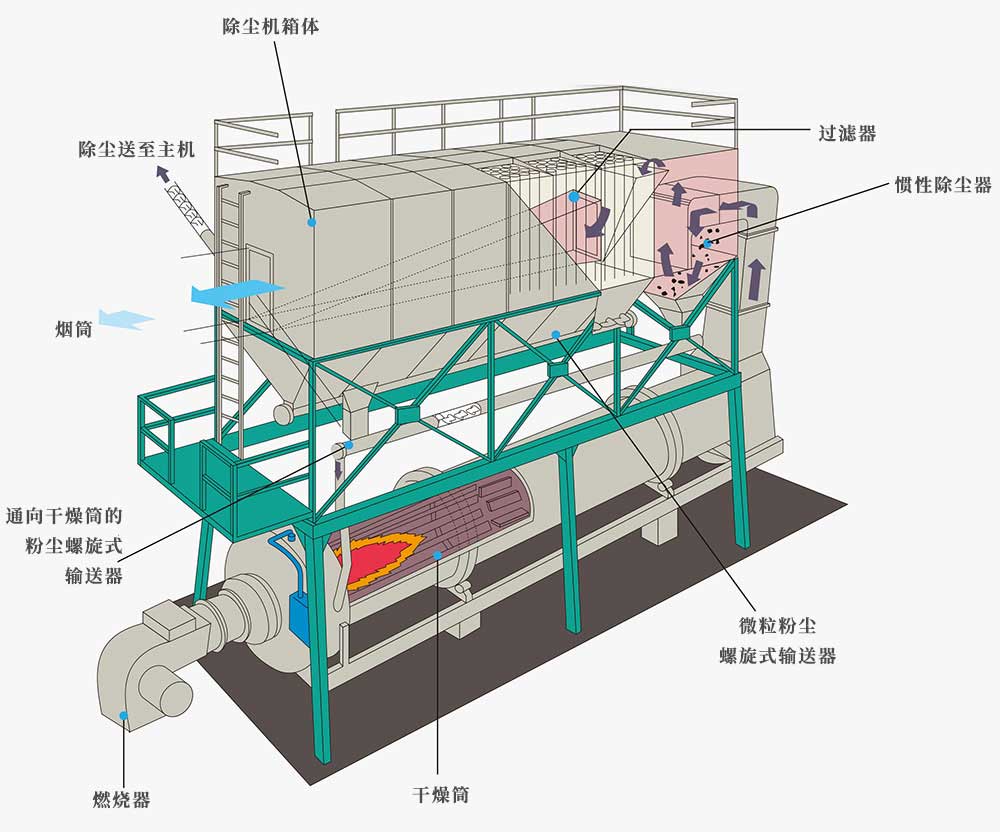 袋式除塵器設(shè)置于干燥滾筒上方使煙道縮短,散熱面積大幅減少。采用高壓脈沖清洗方式,布袋損耗小,壽命長,除塵效果好。
